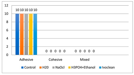 Data were analysed using SPSS Statistics, version 25 (IBM, Armonk, NY, USA) with a significance level set at 0.05. Normality was evaluated using the Shapiro–Wilk test. One-way ANOVA with Tukey’s HSD was used to compare bond strength between groups, while Fisher’s Exact Test was used to assess the difference in failure mode distribution.