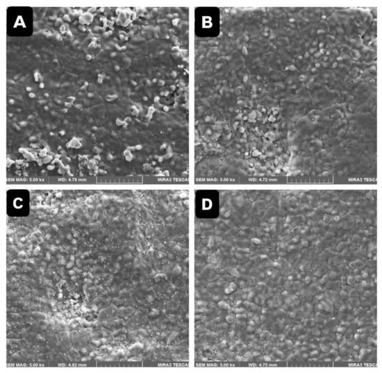 The FESEM showed surface morphology of various zirconia samples at 5000× magnification. (A) Contaminated zirconia with saliva and cleaned with (H3PO4) + ethanol. (B) Contaminated zirconia with saliva and cleaned (H3PO4) only. (C,D) Contaminated zirconia with saliva and cleaned with Ivoclean.