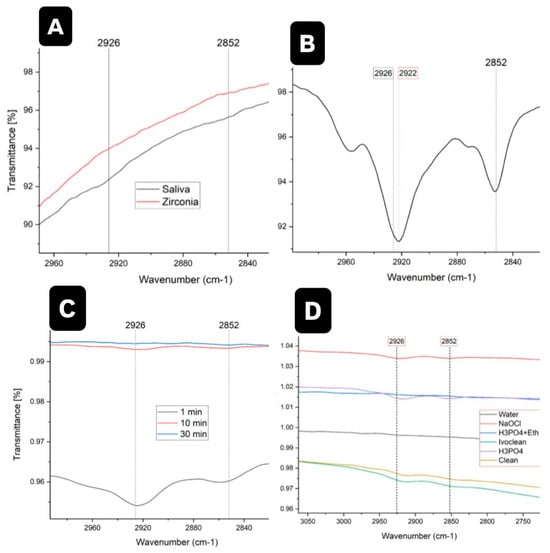 FTIR was used to detect phospholipids in saliva, focusing on the absorption bands at 2852 cm−1 and 2926 cm−1, corresponding to lipid acyl CH2 groups. Tests on the first volunteer showed no detectable phospholipids (Figure 5A), prompting the use of saliva from the second volunteer, in which the presence of phospholipids was confirmed (Figure 5B). Zirconia samples were contaminated with saliva for varying durations (1, 10, and 30 min). Phospholipids were detected in all samples, with the highest concentration found in the 1 min contamination (Figure 5C). After contamination, cleaning with water and phosphoric acid + ethanol removed phospholipids, while cleaning with sodium hypochlorite and Ivoclean left residues. FTIR spectra (Figure 5D) confirmed complete removal by water and phosphoric acid + ethanol.
