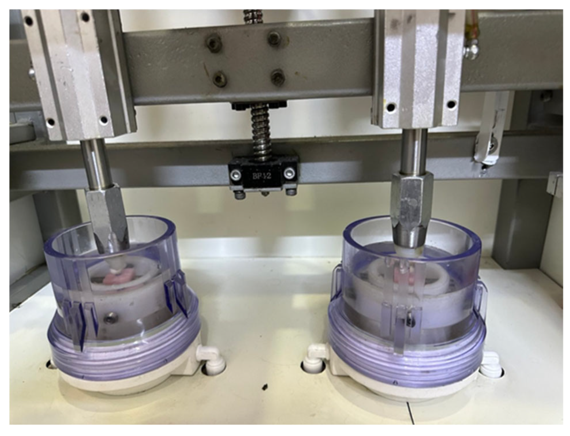 - Stimmelmayr, M.; Edelhoff, D.; Güth, J.F.; Erdelt, K.; Happe, A.; Beuer, F. Wear at the titanium–titanium and titanium–zirconia implant–abutment interface: A comparative in vitro study. Dent. Mater. 2012, 28, 1215–1222. [Google Scholar]