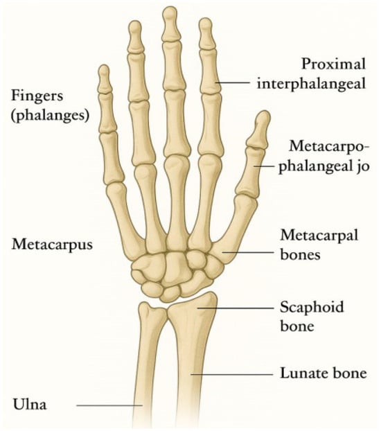 The advent of 3D printing technology has further improved the field of prosthetics by enabling the design and fabrication of customized prosthetic limbs tailored to individual anatomical and functional requirements [4,5]. This approach reduces production costs and accelerates manufacturing, making prosthetic devices more accessible. For instance, organizations like Limbitless Solutions have leveraged 3D printing to create affordable, personalized bionic arms for children with limb differences, significantly improving their quality of life [6]. Combining EMG signal analysis with 3D printing holds immense potential in developing prosthetic hands capable of performing intricate tasks such as grasping objects, typing, and handling utensils. By analyzing EMG signals generated by muscle activity, these prosthetic devices can interpret the user’s intentions and translate them into precise movements. Recent studies have demonstrated the feasibility of this integration, showcasing prosthetic hands that utilize EMG signals and neural networks for real-time control, thereby enhancing dexterity and responsiveness. Research into the human hand’s anatomical structure and functional complexity informs the development of advanced prosthetics [7]. The hand’s dexterity is attributed to its high degree of freedom (DoF), with 27 bones, 29 joints, and intricate muscular and nervous systems enabling a wide range of movements [8]. Figure 1 shows a typical human hand and its 27 individual bones.