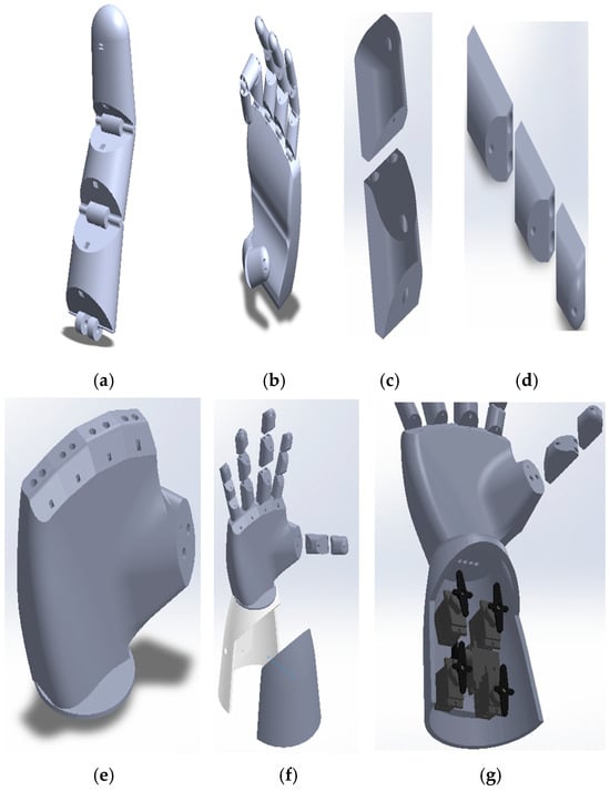 Prosthetic Hand Design—From Early Concepts to Final Assembly: (a) Early Index Design; (b) Early Hand Assembly; (c) Final Index Design; (d) Final Thumb Design; (e) Final Right Palm Design; (f) Forearm Assembly; (g) Forearm Exploded View.