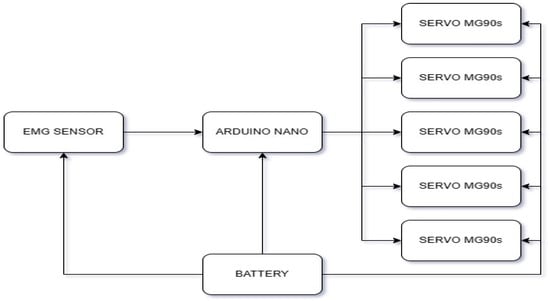 Accurate real-time signal processing is fundamental for seamless prosthetic control. The EMG sensor detects and classifies muscle signals, ensuring precision and reliability. Fast Fourier Transform (FFT) algorithms analyze frequency components, identifying muscle activation patterns. These processed signals are mapped to specific motor commands, enabling intuitive prosthetic movements. The Arduino Nano handles real-time processing, efficiently translating EMG signals into mechanical motion. The signal processing workflow includes amplification, filtering, transformation, and analog-to-digital conversion to ensure accuracy. The microcontroller then interprets the processed signal and generates control commands for the servo motors, enabling responsive prosthetic actuation. The system block diagram is shown in Figure 8.