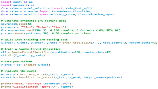The high accuracy of the SVM-based classification system suggests that the developed prosthetic arm can reliably interpret user muscle signals with minimal misclassification. This result translates to improved real-time responsiveness, reducing lag between user intention and prosthetic movement. Future research could explore deep learning approaches (e.g., CNNs, LSTMs) to refine classification further and handle more complex gestures beyond power grip. The developed sourced code is shown in Figure 18.