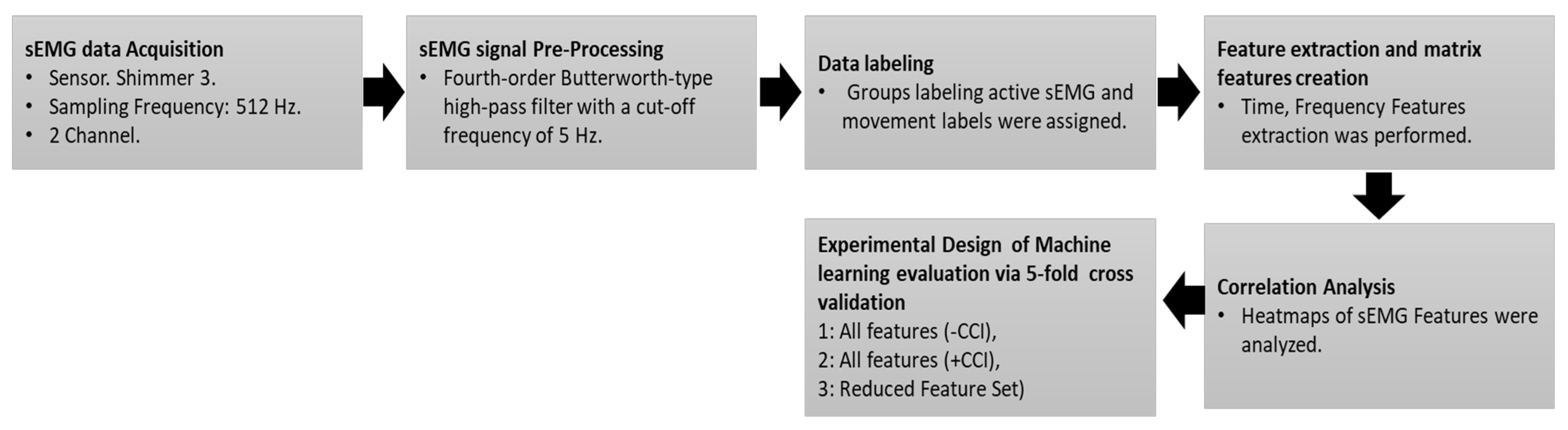 - Gallón, V.M.; Vélez, S.M.; Ramírez, J.; Bolaños, F. Comparison of Machine Learning Algorithms and Feature Extraction Techniques for the Automatic Detection of Surface EMG Activation Timing. Biomed. Signal Process. Control 2024, 94, 106266. [Google Scholar] [CrossRef]