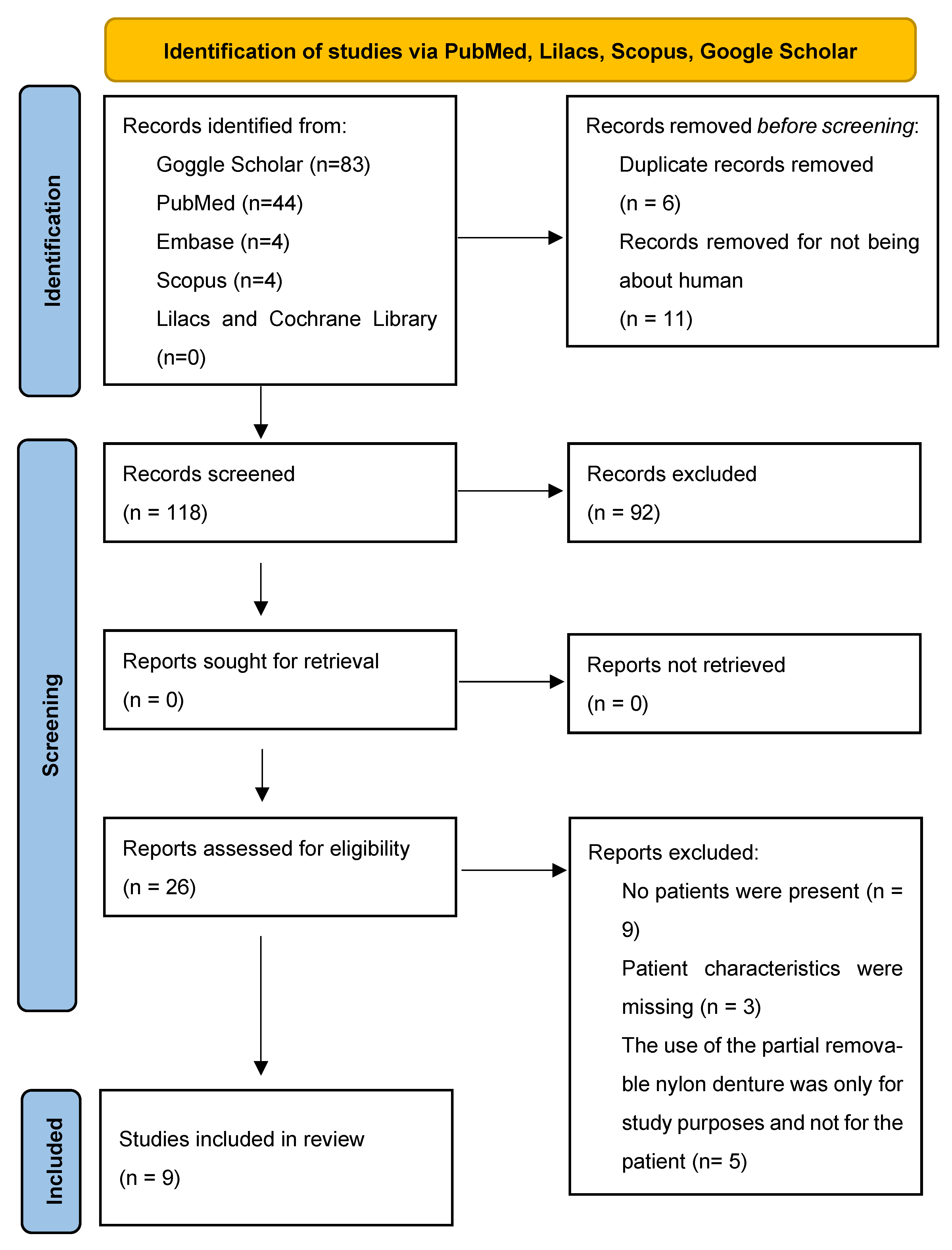 - “Valplast”, “nylon denture”, “polyamide denture”, “nylon prosthesis”, “polyamide prosthesis” to identify studies focused on nylon-based removable partial dentures.