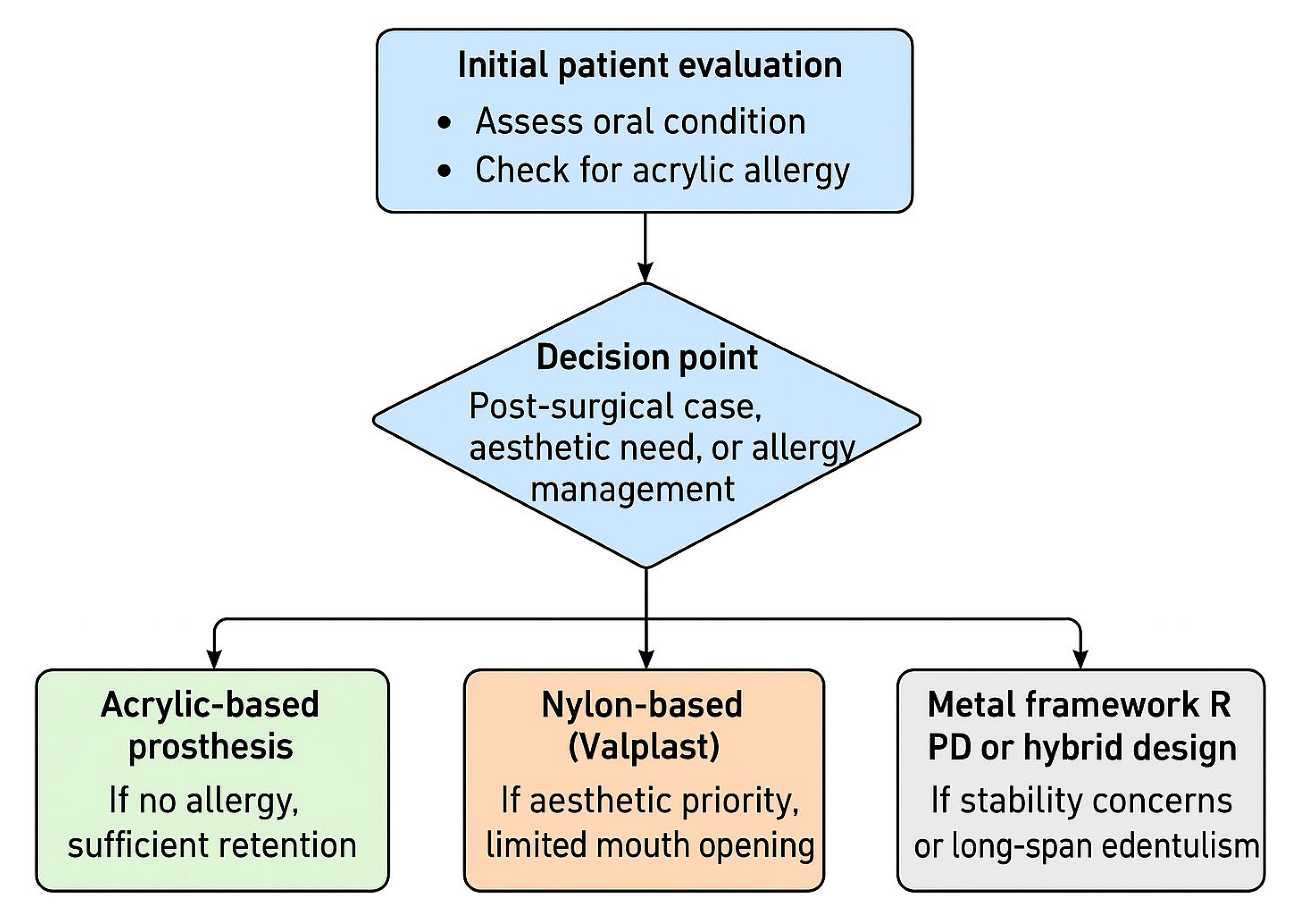 - Nylon-based (Valplast, Figure 3c,d) solutions are most suitable for patients with limited mouth opening, high esthetic expectations, or a history suggestive of acrylic hypersensitivity. However, evidence supporting their superiority is limited by the methodological weaknesses highlighted in this review.