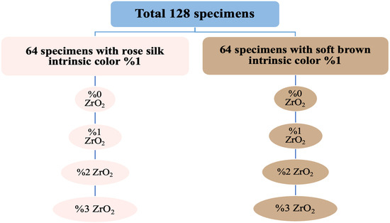 A total of 128 disc-shaped samples were produced and uniformly allocated across twenty experimental groups, each including 8 samples (n = 8) [11,20]. The specimens were produced without the incorporation of ZrO2. In contrast, the samples were created by combining varying quantities of zirconium oxide (1%, 2%, 3% by weight) alongside silicone, with the intrinsic colors of rose silk and soft brown, as demonstrated in Figure 1.