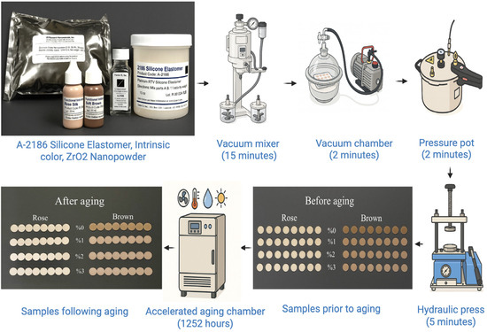 Extraoral maxillofacial prostheses are key therapeutic choices for persons with serious facial structural abnormalities. These impairments may develop from trauma, illnesses, burns, or inherited disability, resulting in psychological and social misery. Patients with these anomalies necessitate multimodal therapeutic intervention, requiring collaboration between the maxillofacial surgeon, prosthodontist, plastic surgeon, and subsequent psychiatric therapy [1,2]. Diverse materials can be employed in maxillofacial prosthesis rehabilitation. Examples of these materials include poly(methyl methacrylate), polyurethane, poly(vinyl chloride) (PVC), chlorinated polyethylene (CPE), and maxillofacial silicone elastomer. Silicone elastomer materials for maxillofacial applications are the primary choice for constructing maxillofacial prostheses, employed to rectify congenital and acquired facial abnormalities due to their texture, biocompatibility, durability, strength, simplicity of manipulation and manufacture, coloring, tensile and tear strength, and patient comfort [3,4]. The success rate of maxillofacial prosthetics is predominantly determined by essential aesthetic factors, such as color accuracy, shape, surface texture, and translucency. Achieving these objectives necessitates the incorporation of pigments into silicone materials through either intrinsic or extrinsic coloration procedures [5,6]. Coloring materials are essential for achieving a realistic look, as intrinsic coloring generally provides enhanced durability and stability; yet, ensuring uniform intrinsic coloration poses persistent technological difficulties [5,7,8]. Color alteration and degradation of the physical behaviors associated with a facial prosthetic device result from many different factors, like exposure to the atmosphere, cosmetic usage, and interaction with sebum and cleaning solvents. Ultraviolet rays are regarded as a crucial element in the degradation of the optical and physical characteristics of elastomers [1,9]. Many researchers have devised artificial weathering to replicate natural environmental conditions. These chambers can be advantageous in assessing the total degradation of materials and are frequently used [10,11].