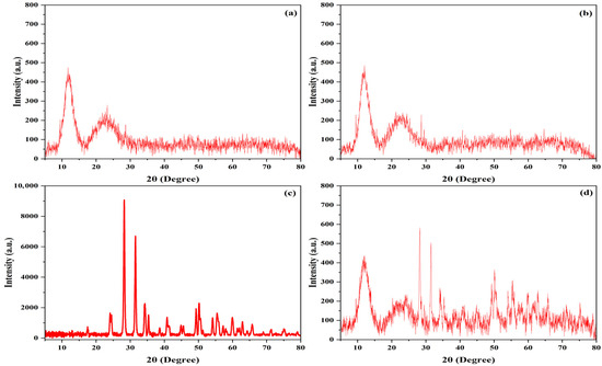 XRD analysis of maxillofacial silicone for (a) brown pigments, (b) rose pigments, (c) ZrO2 nanoparticles, and (d) a composite of ZrO2 with maxillofacial silicone.