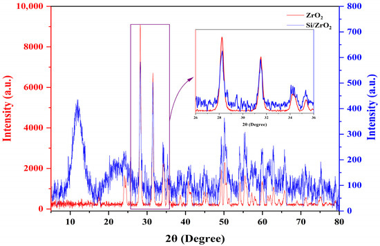 XRD analysis enhances comprehension of the structural characteristics of the maxillofacial silicone elastomers colored with brown and rose, both before and after the incorporation of zirconium oxide nanoparticles. As shown in Figure 3, the unmodified silicone samples (brown and rose) show two broad diffraction peaks at approximately 2θ ≈ 12° and 21°, which is characteristic of amorphous or low-crystalline silicone elastomers. These broad peaks are indicative of the non-crystalline silicone matrix or an elastomeric network, which likely indicates a polymeric system, such as maxillofacial prostheses [25]. The ZrO2 sample shows several distinct peaks that are characteristic of monoclinic zirconia, suggesting it has a definite crystalline form, and the patterns were identical to the (ICSD 98-017-2161) reference code. The patterns that are observed when zirconium oxide is added to the maxillofacial silicone matrix (Si/ZrO2) reveal both broad peaks corresponding to silicone and additional, sharper peaks attributed to zirconium oxide. This evidence indicates that the crystalline nanoparticles of ZrO2 were successfully integrated into the silicon matrix, as shown in Figure 4 [26].