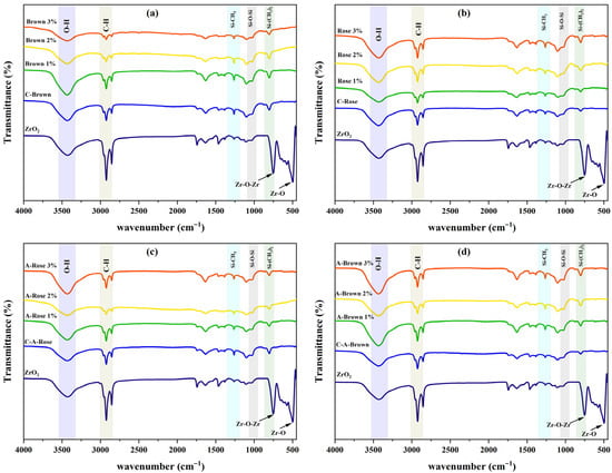 FTIR spectra of ZrO2 particles and maxillofacial silicone incorporated with various wt% of ZrO2 nanoparticles. (a) brown color before ageing; (b) rose before ageing; (c) rose color after ageing; (d) brown color after ageing.