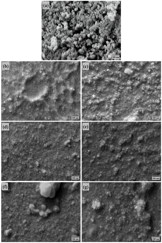 FESEM was used to investigate the morphological variations among the studied samples. Pure ZrO2 nanoparticles, as shown in Figure 6a, appeared consistently spherical, with only slight agglomeration. Pure maxillofacial silicone elastomers loaded with the brown and rose pigments, as illustrated in Figure 6b,c, in the absence of ZrO2, revealed relatively smooth macroscopic surfaces, though each pigment introduced distinct microstructural traits. The brown pigment produced discrete local depressions, whereas the rose pigment rendered the surface broadly rougher yet more uniform. When the same pigmented elastomers were modified with ZrO2 nanoparticles, as shown in Figure 6d,e, surface smoothness and the density of defects improved, pointing to stronger filler–matrix bonding and finer dispersion. Figure 6f,g show that maxillofacial silicone exposed to ultraviolet aging revealed surface deterioration in both formulations. The brown pigmented variant developed a notable agglomeration of ZrO2 and branching microcracks, while the rose pigmented variant sustained milder damage, suggesting pigment identity modulates photostability. Although ZrO2 particles initially fortified morphological coherence and UV resistance, sustained UV irradiation led to surface roughening and possible nanoparticle migration.