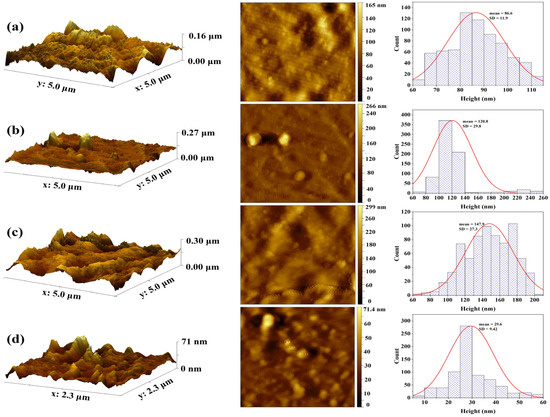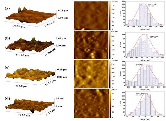 AFM illustration of maxillofacial silicone with brown pigments at (a) brown control, (b) brown 1%, (c) brown 2%, and (d) brown 3% before aging.