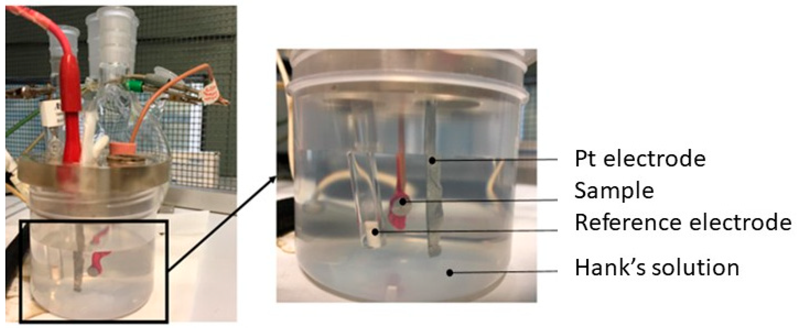 - Radovanović, M.B.; Tasić, Z.Z.; Simonović, A.T.; Petrović, M.; Antonijević, M.M. Corrosion Behavior of Titanium in Simulated Body Solutions with the Addition of Biomolecules. ACS Omega 2020, 5, 12768–12776. [Google Scholar] [CrossRef] [PubMed]
