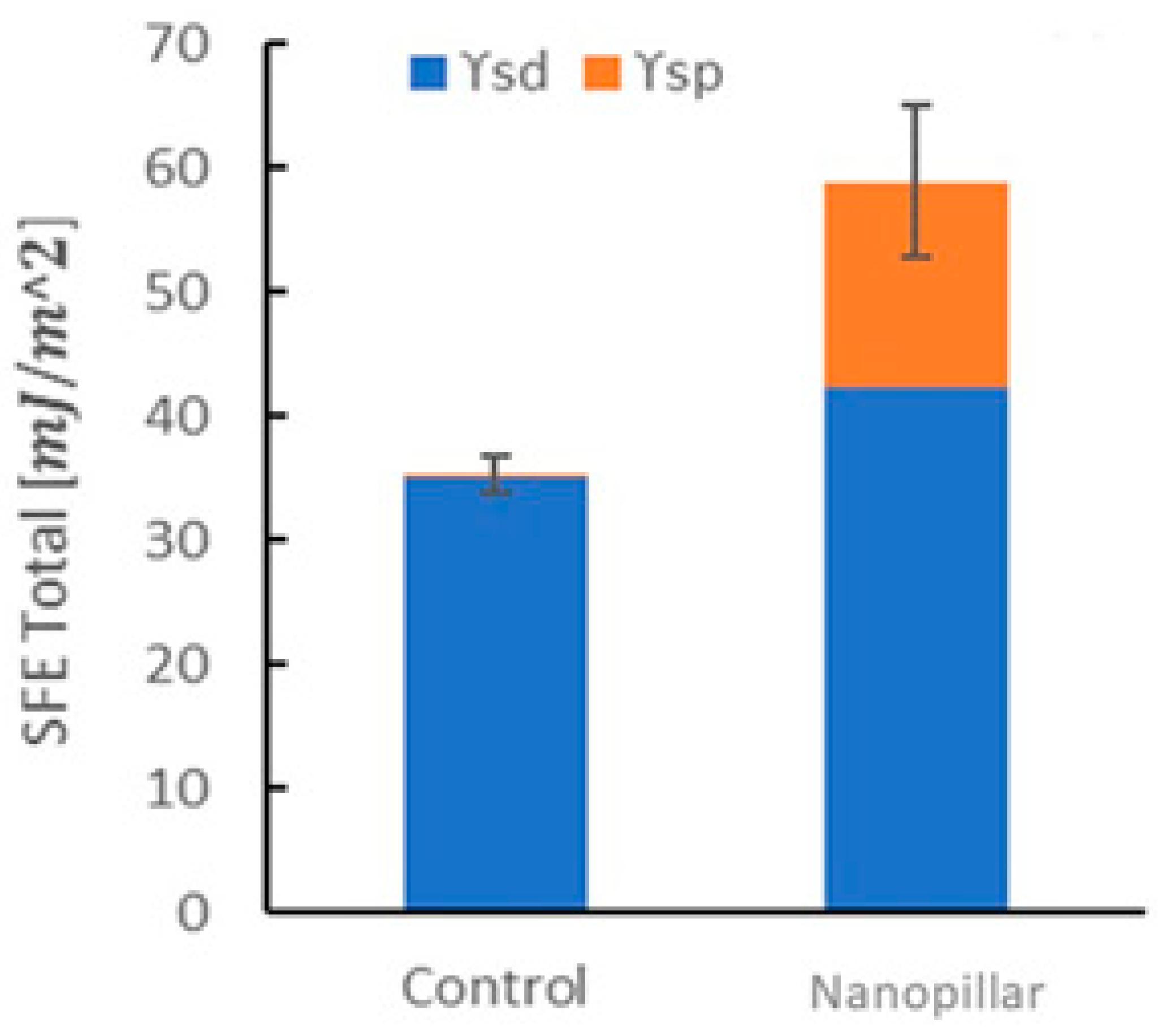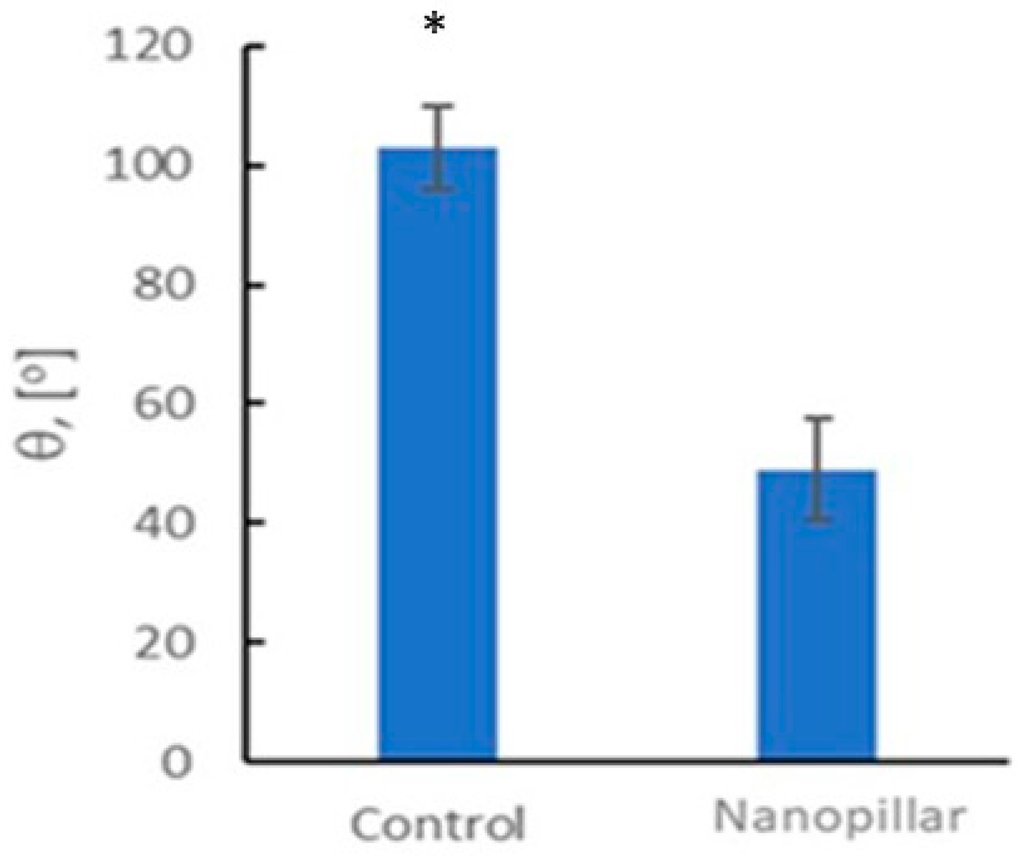 - Hu, Y.; Duan, J.; Yang, X.; Zhang, C.; Fu, W. Wettability and biological responses of titanium surface’s biomimetic hexagonal microstructure. J. Biomater. Appl. 2023, 37, 1112–1123. [Google Scholar] [CrossRef]