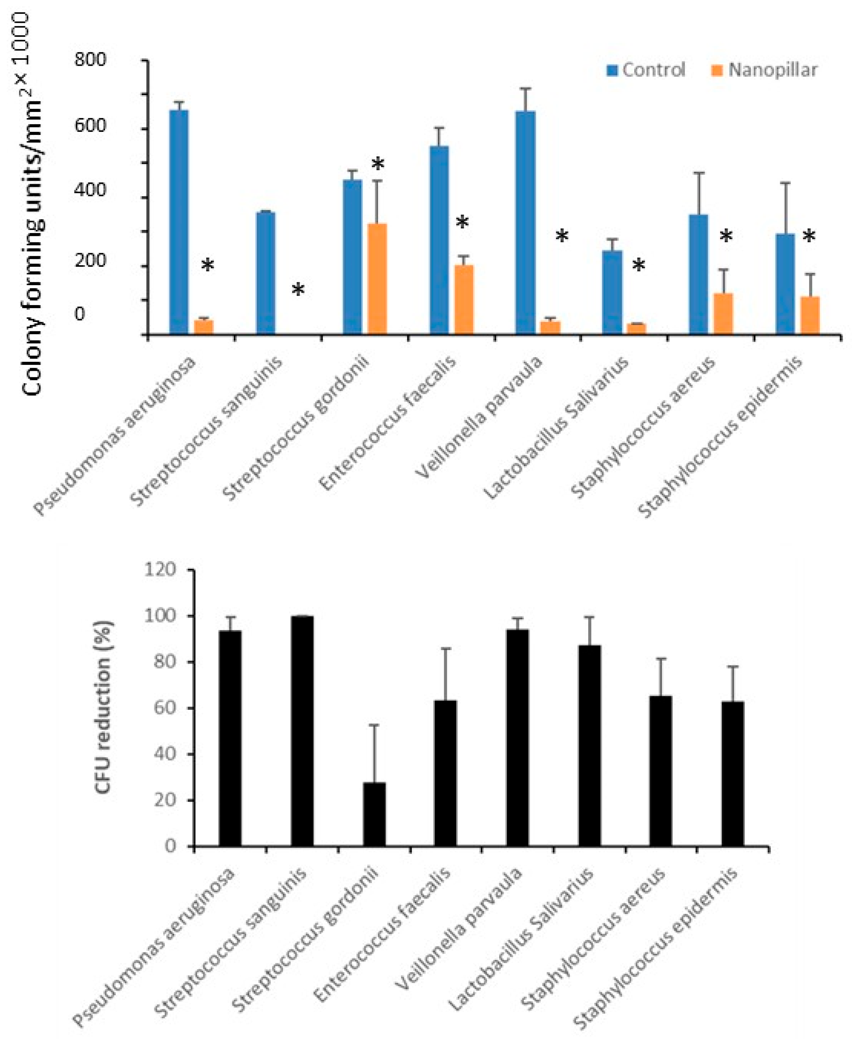 - Kelleher, S.M.; Habimana, O.; Lawler, J.; O’Reilly, B.; Daniels, S.; Casey, E.; Cowley, A. Cicada Wing Surface Topography: An Investigation into the Bactericidal Properties of Nanostructural Features. ACS Appl. Mater. Interfaces 2016, 8, 14966–14974. [Google Scholar] [CrossRef]