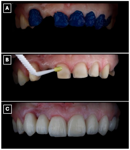 Adhesive cementation of the lithium disilicate single-retainer cantilever resin-bonded fixed dental prosthesis using a light-cured resin cement. (A) Intraoral try-in and seating of the prosthesis prior to polymerization, confirming complete seating of the cantilever retainer, passive adaptation at the adhesive interface, and absence of premature contacts that could induce tensile or shear stresses. (B) Removal of excess resin cement during the gel phase following initial light activation, a critical step to prevent marginal overhangs, reduce plaque retention, and minimize the risk of gingival inflammation or marginal discoloration at the enamel-ceramic interface. (C) Final intraoral view after complete polymerization, demonstrating stable marginal adaptation, controlled occlusal scheme with elimination of functional contacts on the pontic, and harmonious esthetic integration of the restoration within the anterior smile zone, which are essential factors for long-term clinical success of cantilever resin-bonded prostheses.