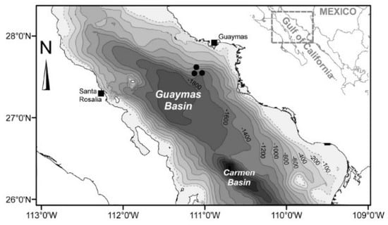 The semi-enclosed Gulf of California (GC) is a marginal sea on the Pacific coast of Mexico and encompasses one of the world’s five most productive and diverse ecosystems, being an important feeding ground for a wide variety of marine organisms [,]. The Guaymas Basin, in the GC, is characterized by the presence of a hydrothermal vent that has an organic-rich sedimentary cover enriched in Mn provided by the Colorado River runoff [,]. These fluids are strongly diluted by seawater during their mixing []. The sediments herein have abundant concentrations of metal sulfites []. The GC is also characterized by the presence of mining complexes and other industrial and urban activities along the coast, responsible for releasing high amounts of metals into this ecosystem (especially Cd, Cu, Fe, Pb and Zn) [,]. García-Rico et al. [] found high levels of Cd, Pb and Zn in the dissolved fraction, while detecting high levels of Cu, Fe and Mn in the particulate fraction. The Partition coefficients of Fe, Mn and Cu were found in high levels, suggesting high metal adsorption onto sediments.