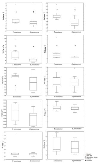 Median concentrations of Cr, Mn, Co, Ni, Cu, Zn, As, Se, Cd and Pb (µg.g−1, dry weight) in T. mexicanus and B. panamense captured in the Gulf of California are presented in Figure 2.