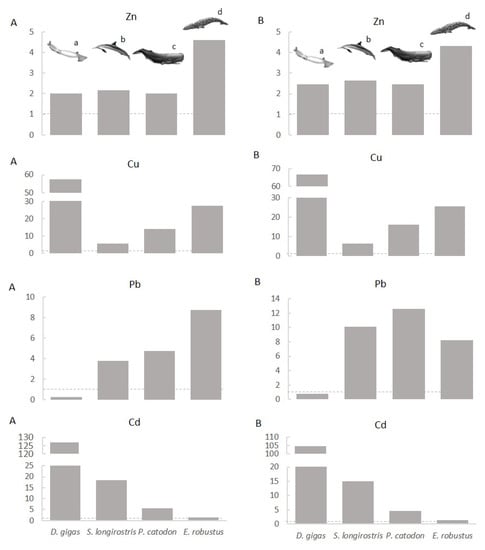 The BMF was calculated to assess the role of T. mexicanus and B. panamense as potential vectors of trace elements. The calculation of the BMF was restricted to four trace elements, two essential - Cu and Zn [,], and two toxic—Cd and Pb [,], to allow comparison with published data. Pauly et al. [] calculated the Trophic Level (TL) of S. longirostris, P. catodon and E. robustus. For D. gigas it was used the TL obtained by Field et al. [], while for T. mexicanus and B. panamense TL values were obtained from the Fishbase database [,].