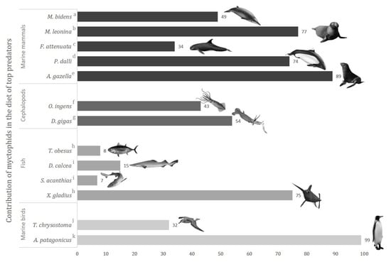 Contribution of myctophids in the diet of top predators from different taxonomic groups. Percentages of frequencies by number (N%) are presented. When different sampling sites or seasons were accessible, the highest documented value was chosen. References: a—Mesoplodon bidens, Pereira et al. []; b—Mirounga leonina, Daneri and Carlini []; c—Feresa attenuata, O’Dwyer et al. []; d—Phocoenoides dalli, Ohizumi et al. []; e—Arctocephalus gazelle, Casaux et al. []; f—Onykia ingens, Cherel and Duhamel []; g—Dosidicus gigas, Markaida and Sosa-Nishizaki []; h—Thunnus obesus and Xiphias gladius, Moteki et al. []; i—Deania calcea and Squalus acanthias, Pethybridge et al. []; j—Thalassarche chrysostoma, Croxall et al. []; k—Aptenodytes patagonicus, Cherel et al. [].