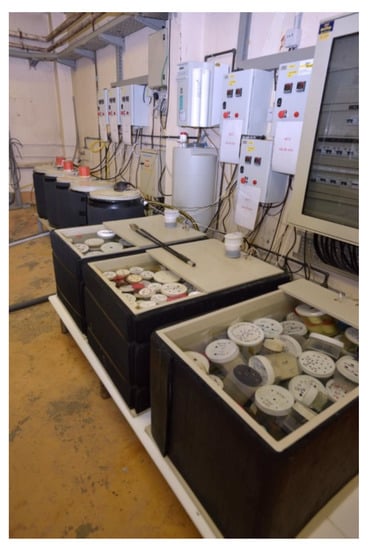 Seawater ageing tanks were used to age composite samples. These 180 L capacity insulated tanks were filled with natural seawater pumped directly from the Brest estuary. This seawater was continuously renewed (volume replaced every 24 h). The temperature was controlled to within ±2 °C (Figure 1) and monitored continuously.