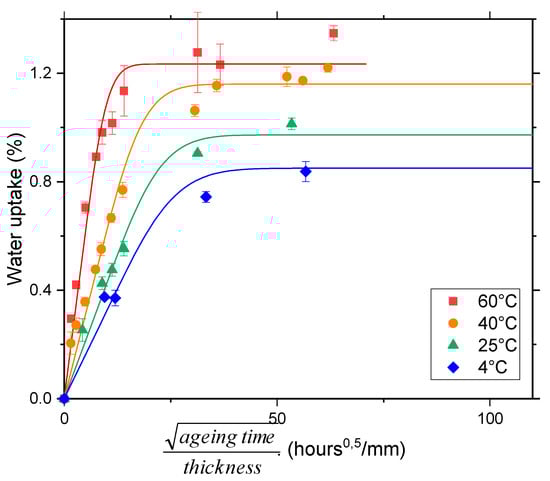 Based on results from the preliminary study, shown in Figure 2, the water temperature for specimen ageing was chosen to be 60 °C. This temperature corresponds to the highest possible accelerating temperature with respect to the material’s dry Tg of 75 °C. The time to saturation of specimens at this temperature was found to be 15 weeks.