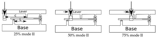 The third test procedure was also based on a standardized test, the mixed mode bending (MMB) []. This test method uses a special lever and base fixture that combines a three-point bending end notched flexure with a DCB test. By adjusting the position of the load point on the lever, different mode I/II combinations are obtained, as shown in Figure 3.