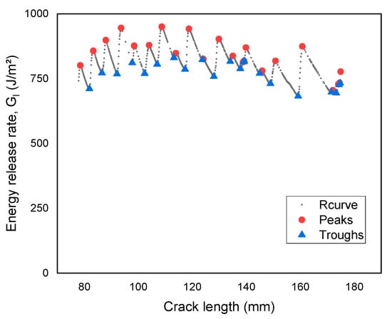 In order to obtain reliable propagation values, a particular data reduction method was developed to process the R-curves (G versus crack length). The curve was first limited to only include data for crack increases of 0.1 mm. This allowed a global average to be calculated without artificially weighting the value. Then, peaks and troughs were automatically retrieved from the curve using an Excel® routine. An example of an R-curve with peaks and troughs is shown in Figure 4.