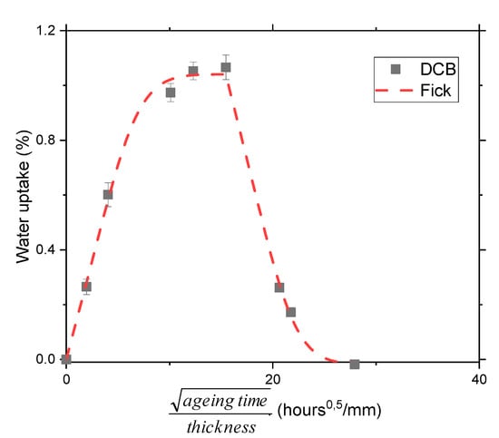 Second, physical ageing effects due to the extended period at 60 °C also contribute to the final value and result in a lower delamination resistance. This contribution will also occur if ageing and drying are performed at lower temperatures and in real marine structures but will require longer times to appear. The ageing protocol adopted here thus provides a conservative value of delamination resistance. Further tests would be required at different times and temperatures to establish the physical ageing kinetics in these composites, as was done for the resin alone previously []. Given the fact that water ingress can also reduce the Tg of epoxy matrices due to plasticization [,,], physical ageing could also finally appear at ageing temperatures considered as too far from Tg to happen in relevant timescales.
