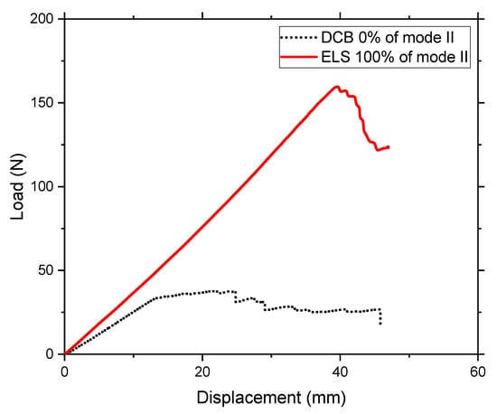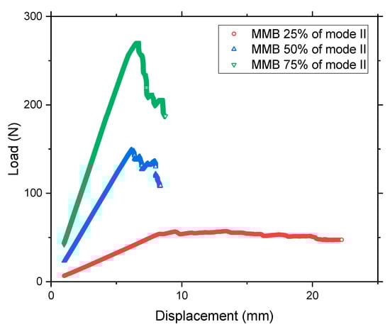 Figure 9 shows an example of the load–displacement plots from mixed mode MMB tests for the three mode ratios. Here, again, the increasing mode II contribution corresponds to higher loads during the test.