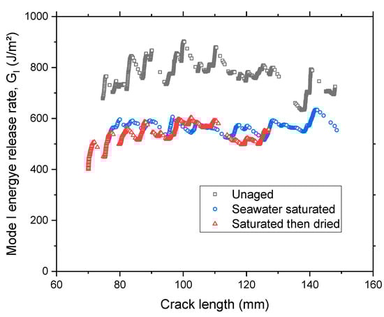 There is some scatter, but it is possible to obtain an average propagation energy release rate of around 800 J/m² for unaged, 600 J/m² for seawater saturated and 560 J/m² for re-dried specimens. Overall, for all the fracture parameters calculated from mode I loading tests, saturation in seawater at 60 °C reduces mode I fracture resistance by around 30% and this change is not reversible after drying.
