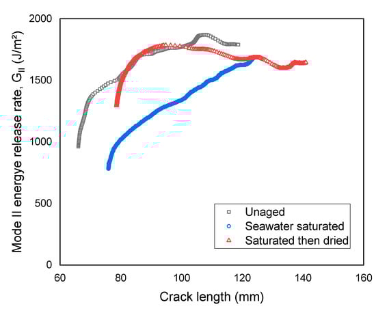 Pure mode II tests show considerably higher scatter than those from 75% mode II, which makes it difficult to formulate conclusions regarding ageing effects. Development of a standard test to measure mode II delamination resistance has proved difficult. Initially, the end notch flexure specimen appeared suitable [,], but the unstable nature of propagation during this test was not satisfactory. Tests promoting stable propagation, using 4-point ENF (End Notched Flexure) [] and end loaded split specimens such as those tested here [] were therefore preferred as they allow multiple values to be measured on each specimen. However, these and all mode II configurations suffer from the influence of friction between the propagating crack surfaces. As a result, some authors have questioned whether a pure mode II test is possible []. For ageing studies, this also introduces an additional unknown factor: the influence of water in the saturated material on friction effects.