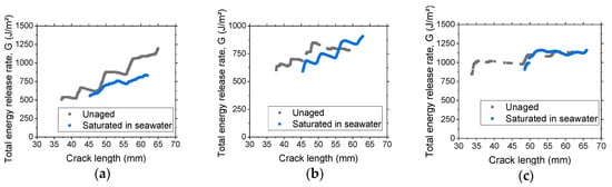 Once again, the overall trend indicates a decrease due to seawater ageing for the mode I dominated fractures, but for the 75% mode II fracture, saturation of specimens tends to result in a slightly higher energy release rate.