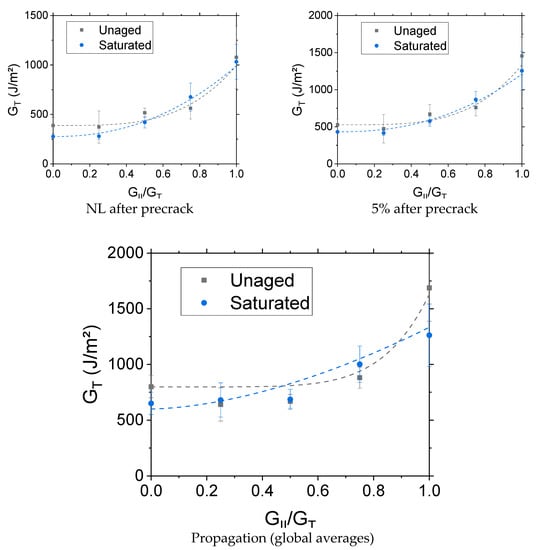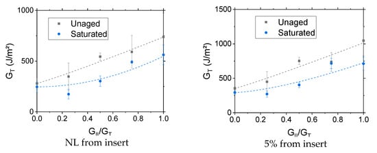 Second, it may be noted that, globally, the influence of seawater saturation on the interlaminar fracture behavior of this carbon/epoxy composite is small given the error bars. The results have been analyzed using the Benzeggagh and Kenane representation (B-K) [] and this provides a reasonably good fit to all data. The n-parameters obtained for the unaged material are compared with published values for a glass/epoxy and carbon/peek composite in Table 5. It is apparent that, for values measured from the insert film, there is a stronger influence of the mode II loading component after saturation, while, for values from a precrack and propagation values, this mode II influence is lower after saturation. No published values were found for this parameter after seawater saturation.