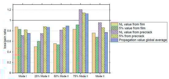 In all these equations, in addition to the terms from previous equations and starting from the calculation of the mode I energy release rate GI, c is the lever length, as shown in Figure 3 in mm, L is the half-span length, also shown in Figure 3 in mm, χ is the crack length correction factor, E11 is the longitudinal modulus measured experimentally at 97 GPa, E22 is the transverse modulus, measured experimentally to be 7.0 GPa and, finally, G13 is the shear modulus estimated to be 8.5 GPa. As for the previous test methods, the loading rate was 1 mm/min. Crack length was also measured using a camera and by painting one of the specimen’s edges, together with numerical interpolation. The results from the MMB test are plotted as the total energy release rate G = GI + GII versus the mode II contribution , as suggested by Benzeggagh and Kenane []. In this study, three ratios of mode mixity were tested, corresponding to mode II percentages of 25, 50 and 75%.