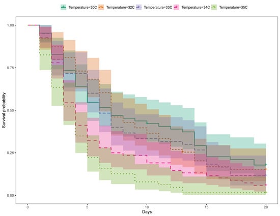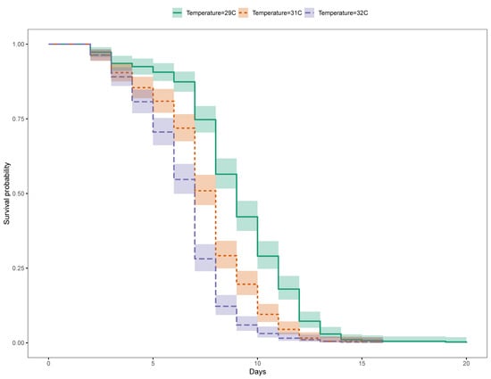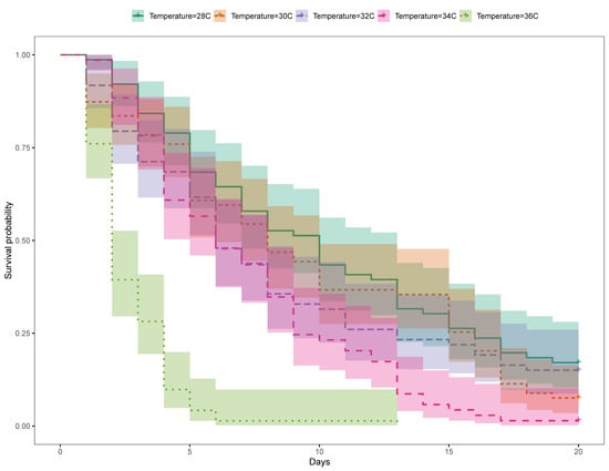 Philippines; Trial 2, Kaplan-Meier survival curves for gnathiids per temperature treatment. Shaded areas are 95% confidence intervals.