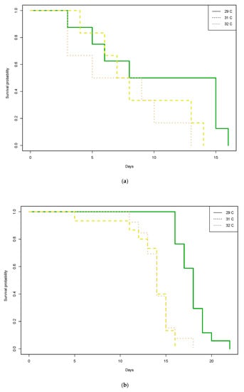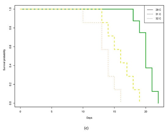 Great Barrier Reef; Kaplan-Meier survival curves for fed gnathiids per temperature treatment for (a) stage one, (b) stage two, and (c) stage three juveniles. For ease of interpretation, 95% confidence intervals are not included.