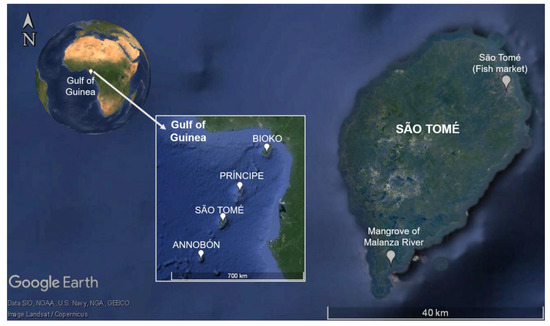 - Wirtz, P.; Ferreira, C.E.L.; Floeter, S.R.; Fricke, R.; Gasparini, J.L.; Iwamoto, T.; Roch, L.; Sampaio, C.L.S.; Schliewen, U.K. Coastal fishes of São Tomé and Principe islands, Gulf of Guinea (eastern Atlantic Ocean)—An update. Zootaxa 2007, 1523, 1–48. [Google Scholar] [CrossRef]