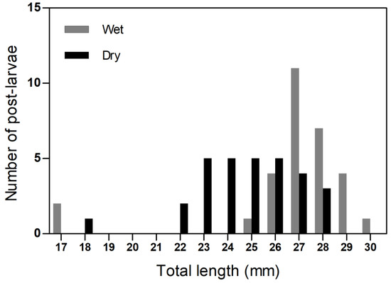 - Radtke, R.L.; Kinzie, R.A.; Shafer, D.J. Temporal and spatial variation in length of larval life and size at settlement of the Hawaiian amphidromous goby Lentipes concolor. J. Fish Biol. 2001, 59, 928–938. [Google Scholar] [CrossRef]
