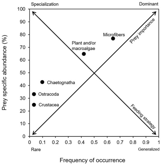 - Amundsen, P.A.; Gabler, H.M.; Stald-Vik, F.J. A new approach to graphical analysis of feeding strategy from stomach contents data-modification of the Costello (1990) method. J. Fish Biol. 1996, 48, 607–614. [Google Scholar] [CrossRef]