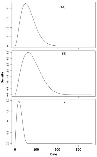 Elicited probability distributions for scenarios 1A (extended low salinity event in “poor” environment, 1B (extended low salinity event in “good” environment) and 2 (acute salinity change) showing the length in days of exposure resulting in death of the average bottlenose dolphin.