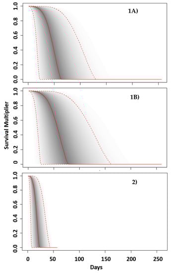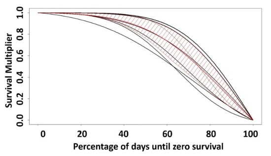 Expert judgements showed broad agreement over the shape by which continuous exposure would affect animal health (ultimately resulting in death), as shown in Figure 2. Experts agreed that animals can tolerate some exposure but that weaker animals, likely a small proportion of the population, could succumb early (e.g., young and very old animals, animals in poor health). Experts considered that the main pathway to mortality is via the skin and this likely takes some time to manifest, with the skin barrier degrading gradually as the exposure duration increases. However, once the skin barrier is compromised, a positive feedback loop exists, such that animals’ condition progressively worsens, leading to increased infections, decompensation of adrenal and renal systems in addition to other chronic illnesses, and subsequent malnutrition. Experts judged that animals in the best condition at the start of low salinity exposure would die last. Figure 3 shows the resulting dose–response function from the combination of scenario-specific distributions with the generalized dose function shape, while Figures S1 and S2 show realizations drawn from these functions.