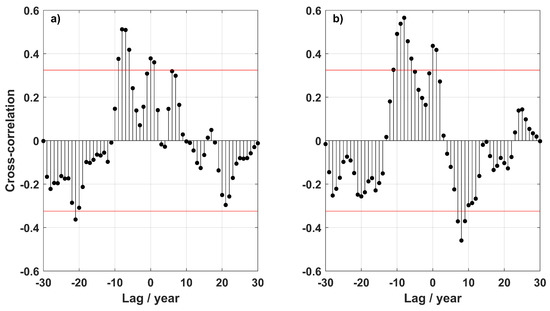 (a) Cross-correlation between the North Atlantic Oscillation and the CTD/Argo temperature detrended anomaly time-series, and the EN4 temperature anomaly time-series (b). The cross-correlation was calculated using 3-years running mean of both NAO-winter index and the annual mean temperature anomaly time-series. Red lines represent the upper and lower 95% confidence bounds.