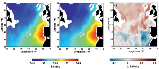 (a) Salinity distribution averaged at the core of Mediterranean Outflow Water (MOW) (1000–1100 m) from the World Ocean Atlas (WOA18 in [33]) between 1965–1974 and (b) between 1985–1994. (c) Salinity difference between the periods 1965–1974 and 1985–1994.