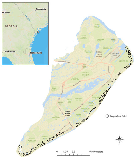 The cut-off distance of 457 m was implemented based on the suggestions by the previous studies [15,19] that examined the impacts of various coastal hazards on property values in similar areas. Landry and Hindsley (2011) [19] examined the impact of negative shoreline change rate on property prices in Tybee Island, GA considering various cut-off distances (100 m to 600 m) from the shoreline. Model parameters for cut-off distances greater than 300 m were found to be statistically insignificant.