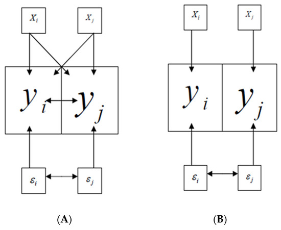 Spatial dependency ((A)—spatial lag dependency; (B)—spatial error dependency).