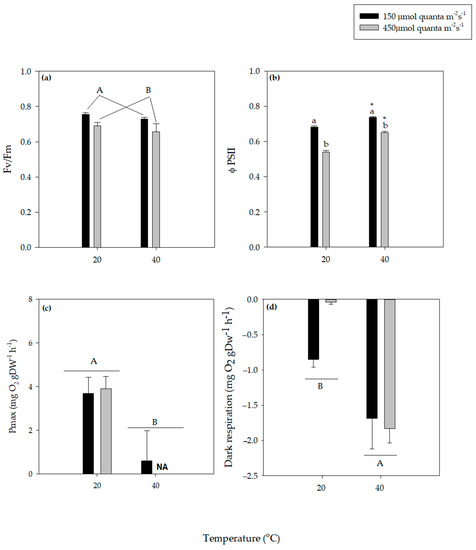 All results are presented as mean ± standard error. The effects of temperature (20 °C, 40 °C) and light (150 and 450 µmol quanta m−2 s−1) on the variables measured were tested using Two-way analyses of variance (ANOVA) after checking parametric assumptions. The Student–Newman–Keuls post-hoc test was used for significant differences between factor levels. All data treatment and statistical analysis were performed using Sigma Stat/SigmaPlot (SPSS Inc., v. 11) software package.