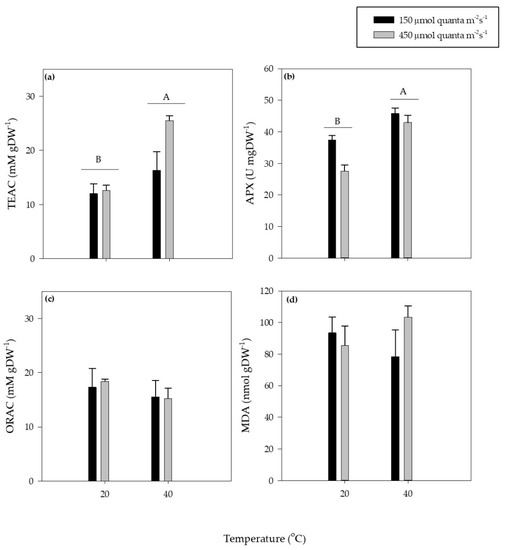 The experimental heatwave of 40 °C increased both the antioxidant activity quantified by TEAC (Figure 2a) and of the APX activity (Figure 2b). APX activity was 1.4-fold higher in leaves at 40 °C than at 20 °C. ORAC was not affected by temperature (Figure 2c) and none of the antioxidant responses tested were affected by light (Figure 2).